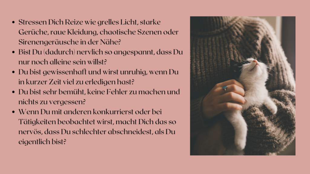 Wenn Du mindestens 14 der Fragen mit „Ja“ beantworten kannst (ggf. auch weniger, aber dafür besonders stark), ist die Wahrscheinlichkeit hoch, dass Du hochsensibel bist.