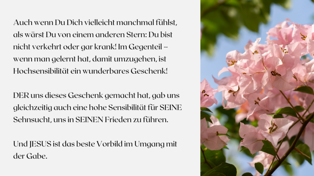 JESUS diente mit seinem äußerst sensiblen Geist und seiner Gabe und er trug die Lasten von uns allen. Doch er schützte sich auch, zog sich in die Einsamkeit zurück, um ungestört Gemeinschaft mit seinem himmlischen Vater haben zu können.